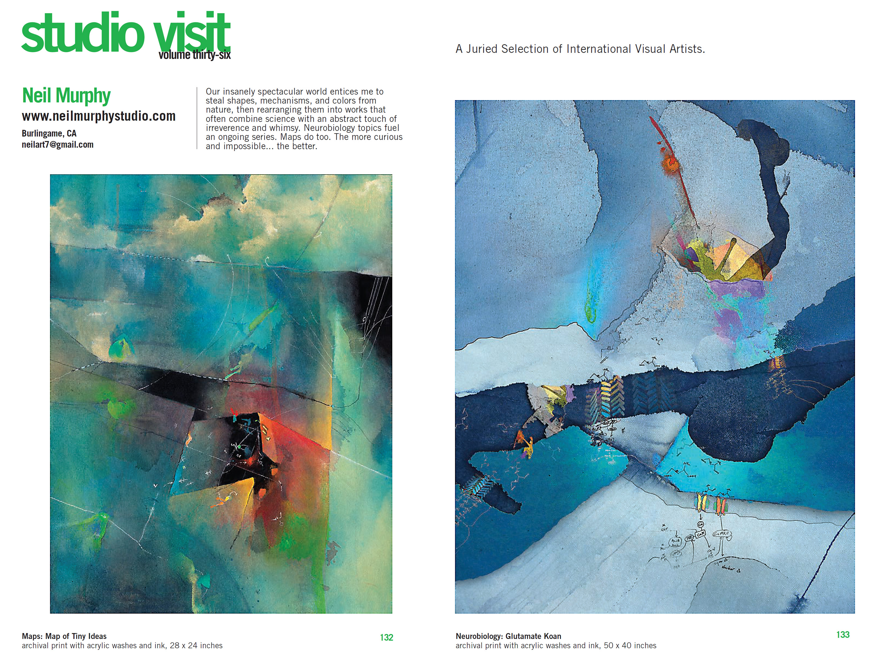 Some of this paintings are relatively naturalistic views of cliffs and rocks, all in deep blues, amid which white lines curl toward arrows at their ends, forming both river currents and vectors of movement and energy. Others are more abstract, sprinkled with tiny arrows, free-form geometric shapes and other simple but eccentric forms, although the sense of nature, and of natural forces, is never far away these tiny shapes hover in indeterminate spaces, linked together by lines of force that are sometimes visible, sometimes the function of minutely calculated intervals and relationships, and they form a fascinating visual analogy to the erratic rhythms and effects of electronically mixed and natural sounds that Murphy has designed to complement his paintings.