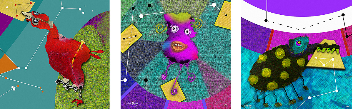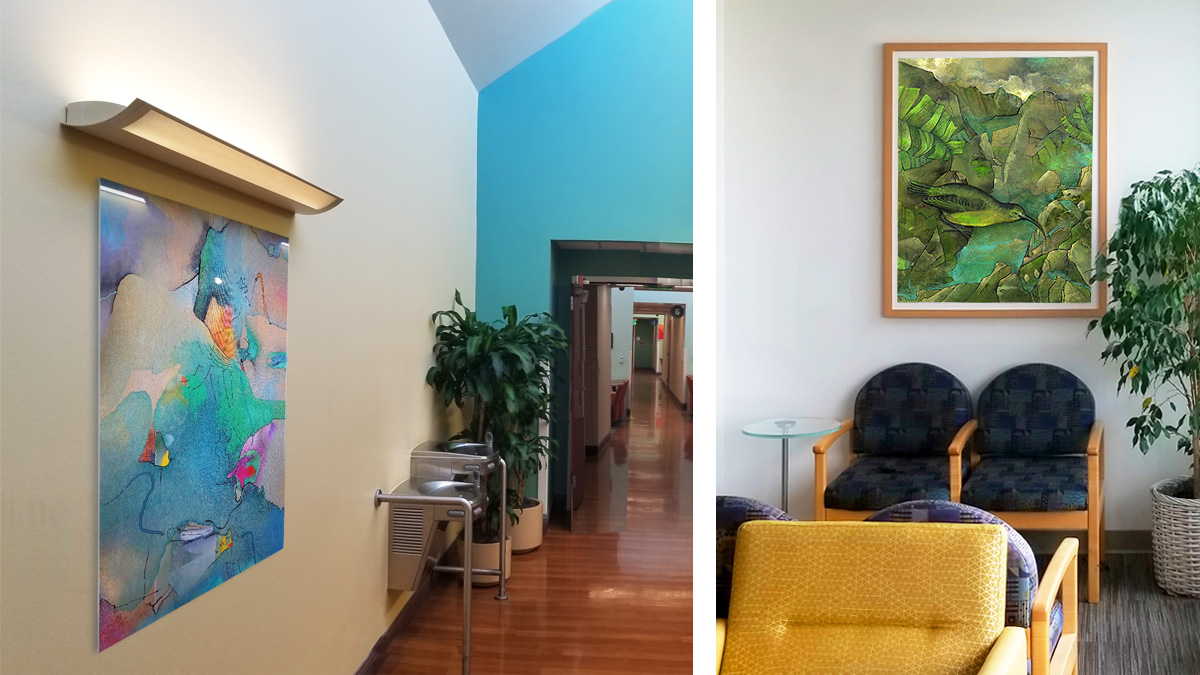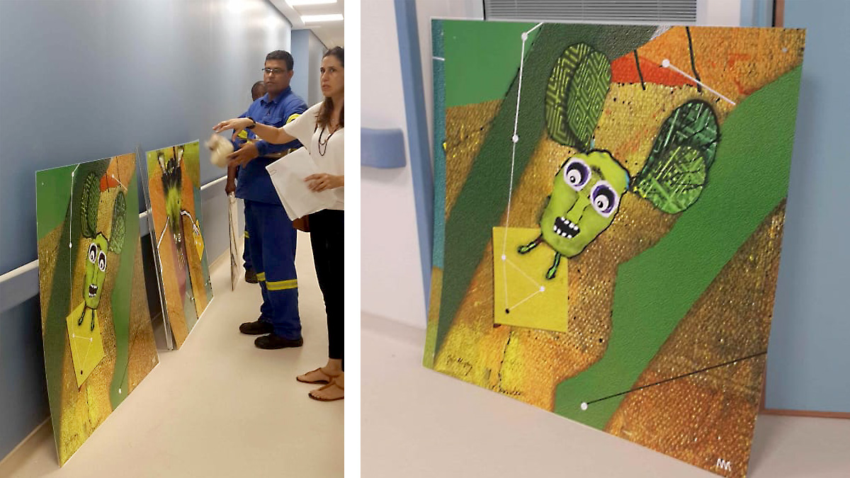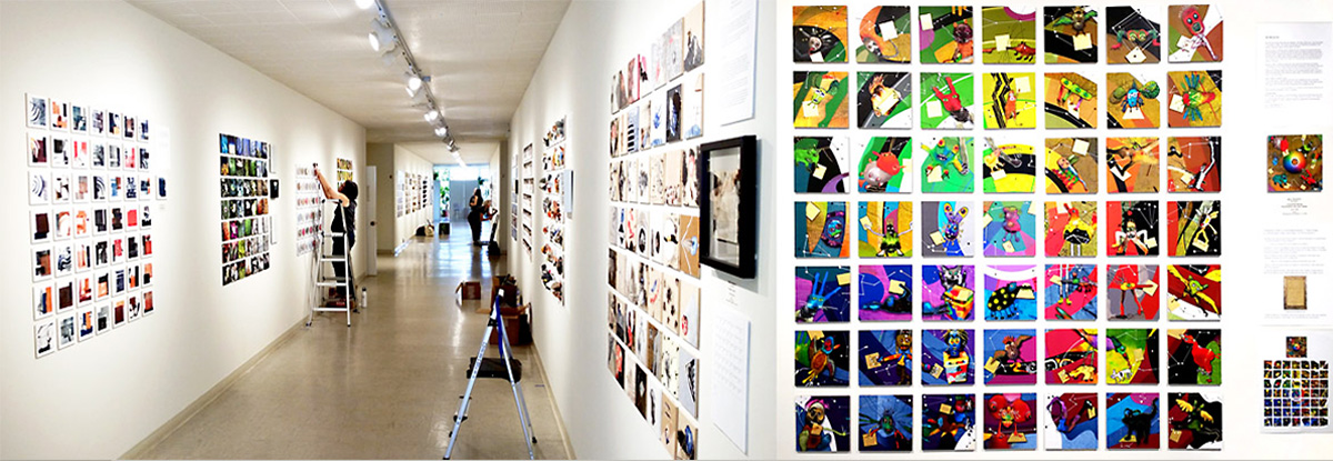 The photo below shows the installation process of the 50 small "Bad Beasts" at the Sanchez Art Center. Other artists are installing their 50 small artworks too. My 50 are shown on the left. They grew 'big' for the hospital - as you can see in the other !